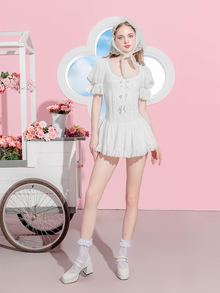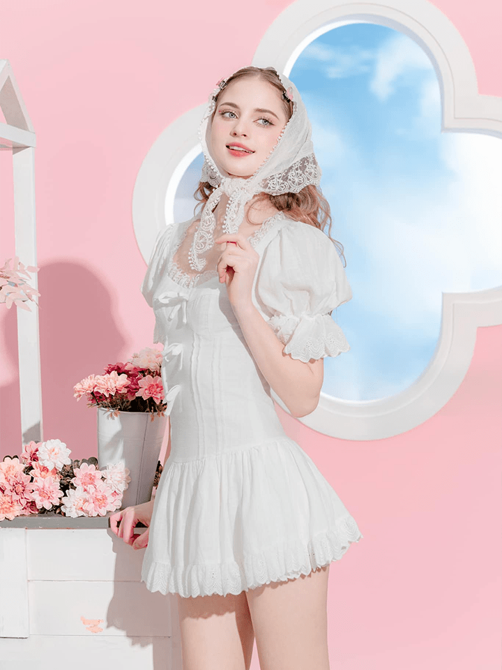 White Cottagecore Dress with Bonnet “Lace Bloom”